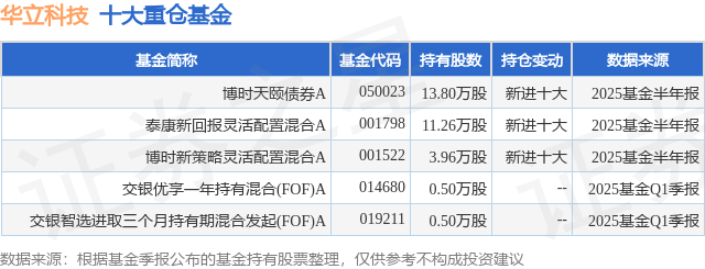 根据2025基金半年报公募基金重仓股数据,重仓该股的公募基金共3家,其中持有数量最多的公募基金为博时基金的博时天颐债券A。博时天颐债券A目前规模为1.62亿元,最新净值1.7744(9月23日),较上一交易日下跌0.32%,近一年上涨35.77%。该公募基金现任基金经理为李重阳 罗霄。罗霄在任的基金产品包括:博时稳健回报债券(LOF)C,管理时间为2022年9月30日至今,期间收益率为11.04%;博时稳定价值债券A,管理时间为2023年7月28日至今,期间收益率为11.65%;博时稳健增利债券A,管理时间为2023年10月20日至今,期间收益率为14.45%;博时恒进持有期混合A,管理时间为2024年2月2日至今,期间收益率为12.81%。李重阳在任的基金产品包括:博时新策略灵活配置混合A,管理时间为2023年10月17日至今,期间收益率为0.39%。