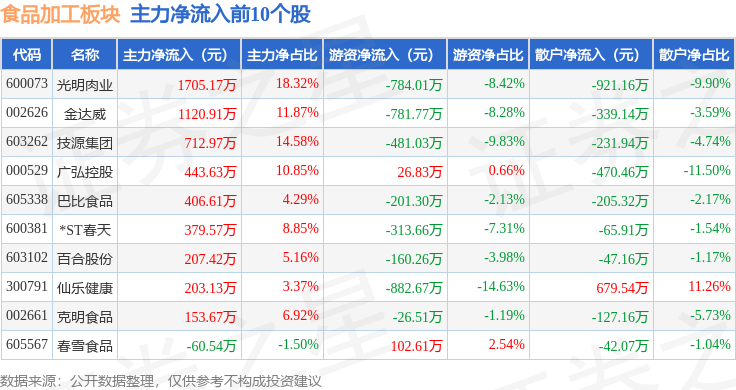 从资金流向上来看,当日食品加工板块主力资金净流出5.67亿元,游资资金净流入3.18亿元,散户资金净流入2.49亿元。食品加工板块个股资金流向见下表: