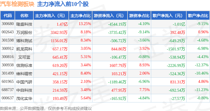 从资金流向上来看,当日汽车检测板块主力资金净流入1.11亿元,游资资金净流出1.5亿元,散户资金净流入3884.88万元。汽车检测板块个股资金流向见下表: