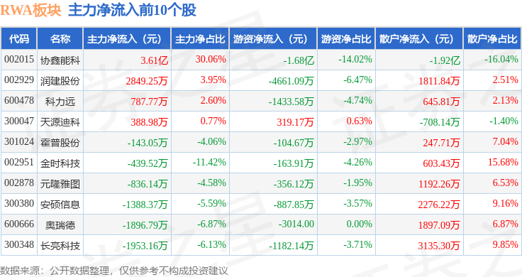 从资金流向上来看,当日RWA板块主力资金净流出7229.97万元,游资资金净流出2.87亿元,散户资金净流入3.59亿元。RWA板块个股资金流向见下表: