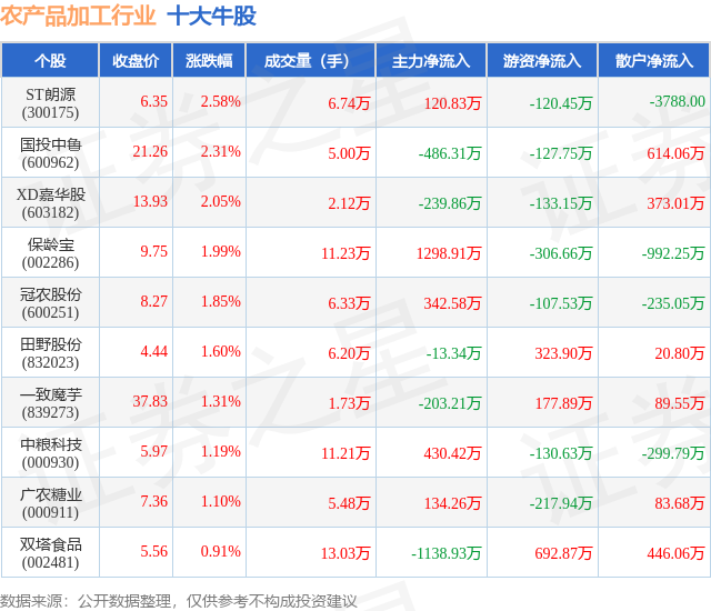 个股表现方面,农产品加工行业当日领涨股为ST朗源(300175),该股当日报收6.35,上涨2.58%,成交量6.74万,主力资金净流入120.83万元。国投中鲁(600962)以上涨2.31%紧随其后,该股当日成交量5.0万,主力资金净流出486.31万元。除此之外,XD嘉华股(603182)、保龄宝(002286)、冠农股份(600251)均进入当日牛股之列。具体个股列表见下表: