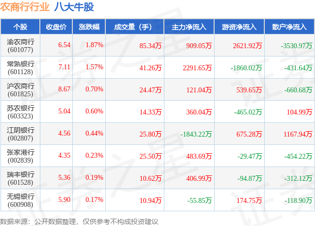 个股表现方面,农商行行业当日领涨股为渝农商行(601077),该股当日报收6.54,上涨1.87%,成交量85.34万,主力资金净流入909.05万元。常熟银行(601128)以上涨1.57%紧随其后,该股当日成交量41.26万,主力资金净流入2291.65万元。除此之外,沪农商行(601825)、苏农银行(603323)、江阴银行(002807)均进入当日牛股之列。具体个股列表见下表: