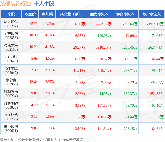 个股表现方面,装修装饰行业当日领涨股为德才股份(605287),该股当日报收22.71,上涨7.78%,成交量6.98万,主力资金净流入2227.76万元。美芝股份(002856)以上涨4.46%紧随其后,该股当日成交量6.25万,主力资金净流出100.06万元。除此之外,海南发展(002163)、ST瑞和(002620)、*ST宝鹰(002047)均进入当日牛股之列。具体个股列表见下表: