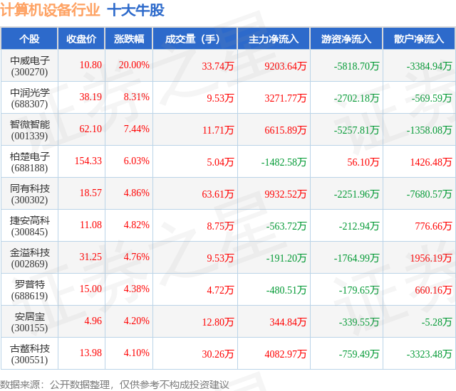 个股表现方面,计算机设备行业当日领涨股为中威电子(300270),该股当日报收10.8,上涨20.0%,成交量33.74万,主力资金净流入9203.64万元。中润光学(688307)以上涨8.31%紧随其后,该股当日成交量9.53万,主力资金净流入3271.77万元。除此之外,智微智能(001339)、柏楚电子(688188)、同有科技(300302)均进入当日牛股之列。具体个股列表见下表: