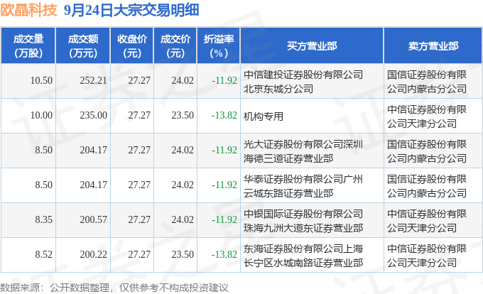 证券之星消息,9月24日欧晶科技发生大宗交易,交易数据如下: