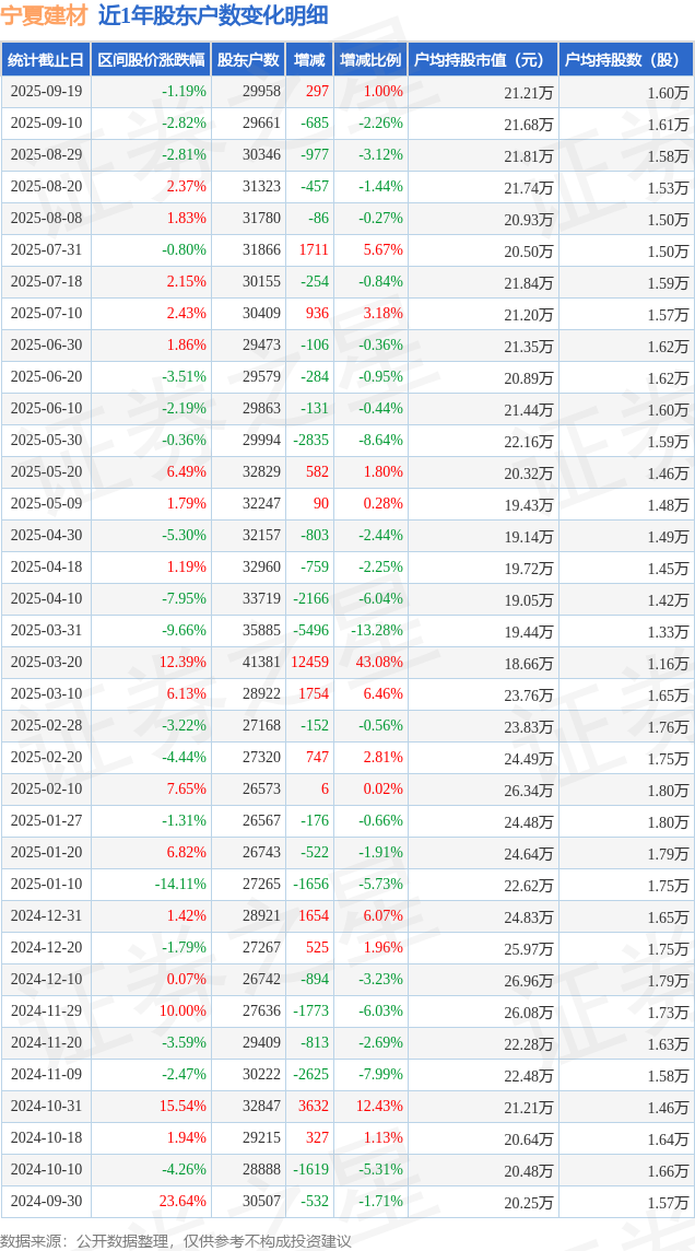 从股价来看,2025年9月10日至2025年9月19日,宁夏建材区间跌幅为1.19%,在此期间股东户数增加297.0户,增幅为1.0%。