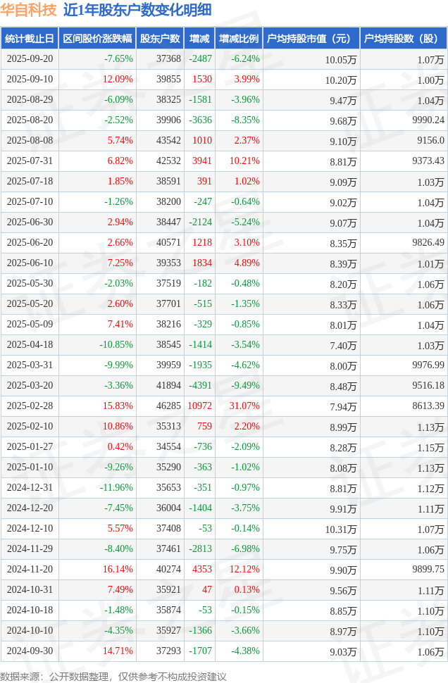 从股价来看,2025年9月10日至2025年9月20日,华自科技区间跌幅为7.65%,在此期间股东户数减少2487.0户,减幅为6.24%。
