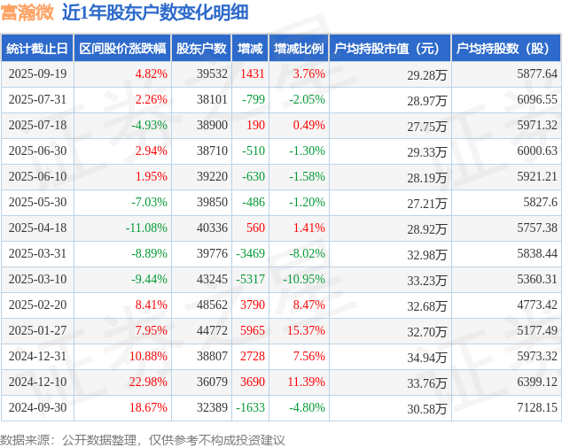 从股价来看,2025年7月31日至2025年9月19日,富瀚微区间涨幅为4.82%,在此期间股东户数增加1431.0户,增幅为3.76%。
