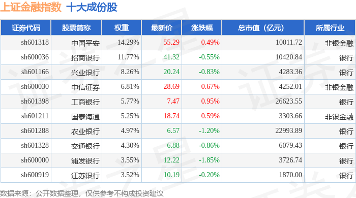 证券之星消息,9月24日,上证金融(000038)指数报收于5515.54点,跌0.06%,成交406.68亿元,换手率0.29%。当日该指数成份股中,上涨的有16家,工商银行以0.95%的涨幅领涨,下跌的有14家,浦发银行以1.85%的跌幅领跌。