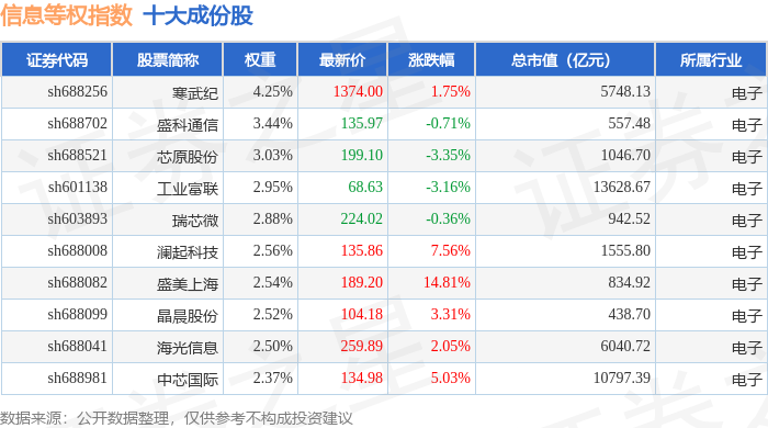 证券之星消息,9月24日,信息等权(000077)指数报收于6284.38点,涨3.1%,成交1965.48亿元,换手率3.41%。当日该指数成份股中,上涨的有42家,盛美上海以14.81%的涨幅领涨,下跌的有8家,景旺电子以6.2%的跌幅领跌。