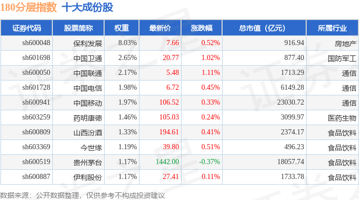 证券之星消息,9月24日,180分层(000093)指数报收于12088.21点,涨0.68%,成交3143.5亿元,换手率0.49%。当日该指数成份股中,上涨的有120家,拓荆科技以9.7%的涨幅领涨,下跌的有53家,上汽集团以5.56%的跌幅领跌。