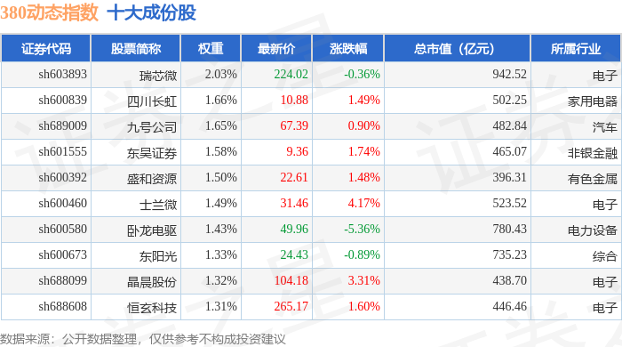 380动态(000141)指数十大成份股详情如下: