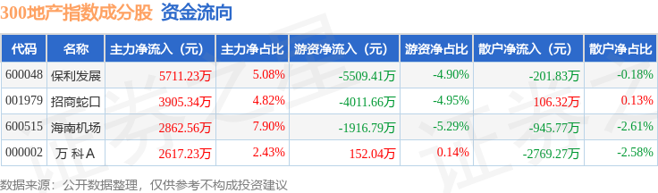 资金流向方面,300地产(000952)指数成份股当日主力资金净流入合计1.51亿元,游资资金净流出合计1.13亿元,散户资金净流出合计3810.54万元。成份股资金流向详情见下表: