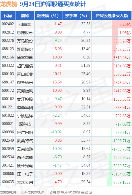 龙虎榜中有沪股通/深股通专用席位(北向资金)现身的个股共25家,其中和而泰以净买入3.25亿元排名第一。详情见下表:
