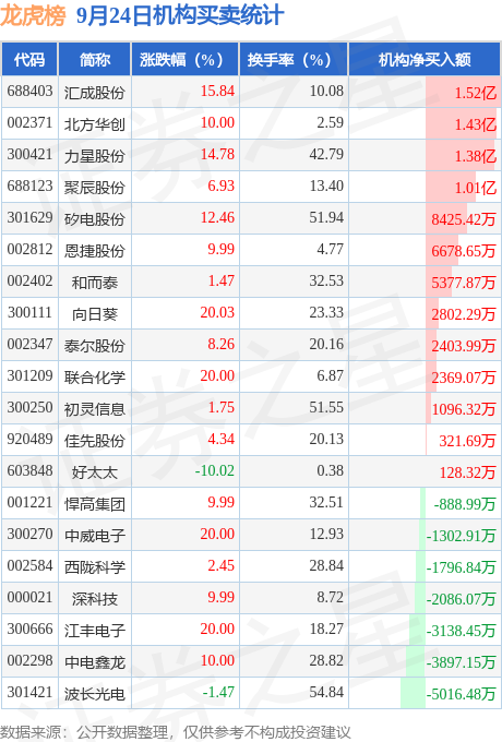 当日公布的交易所龙虎榜中有机构专用席位现身的个股共24家,其中汇成股份以净买入1.52亿元排名第一。详情见下表: