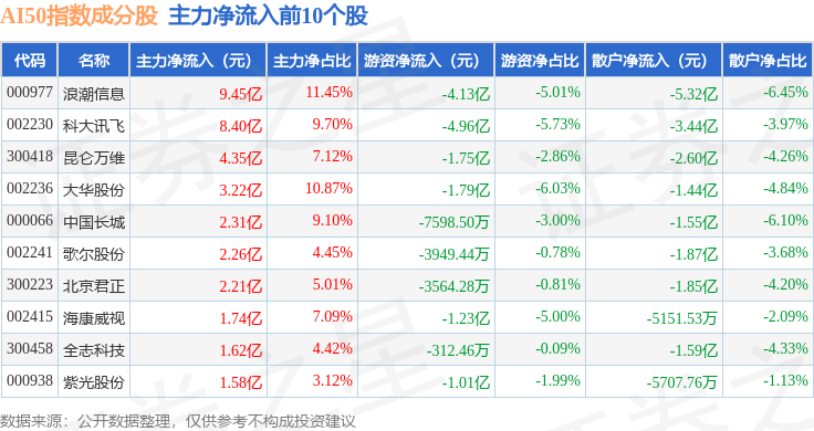 资金流向方面,AI50(399284)指数成份股当日主力资金净流入合计16.39亿元,游资资金净流出合计14.77亿元,散户资金净流出合计1.61亿元。成份股资金流向详情见下表: