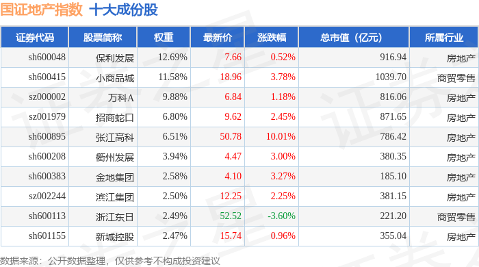 证券之星消息,9月24日,国证地产(399393)指数报收于3491.06点,涨2.62%,成交228.12亿元,换手率2.15%。当日该指数成份股中,上涨的有46家,上海临港以10.01%的涨幅领涨,下跌的有3家,香江控股以9.46%的跌幅领跌。