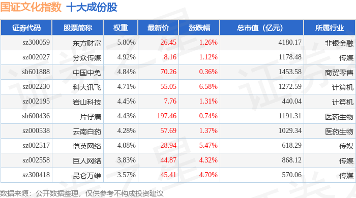 证券之星消息,9月24日,国证文化(399397)指数报收于2420.4点,涨1.98%,成交647.91亿元,换手率3.42%。当日该指数成份股中,上涨的有42家,东方明珠以10.03%的涨幅领涨,下跌的有8家,利欧股份以6.55%的跌幅领跌。