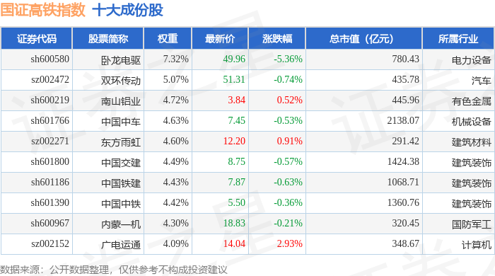 证券之星消息,9月24日,国证高铁(399419)指数报收于2210.48点,涨0.11%,成交295.61亿元,换手率0.92%。当日该指数成份股中,上涨的有37家,运达科技以5.65%的涨幅领涨,下跌的有13家,卧龙电驱以5.36%的跌幅领跌。