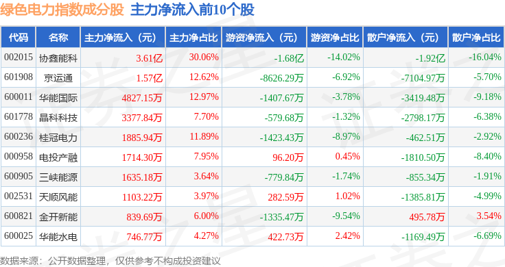 资金流向方面,绿色电力(399438)指数成份股当日主力资金净流出合计3.66亿元,游资资金净流入合计1.93亿元,散户资金净流入合计1.73亿元。成份股资金流向详情见下表: