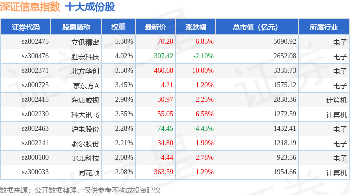证券之星消息,9月24日,深证信息(399620)指数报收于5941.32点,涨2.77%,成交3396.48亿元,换手率4.67%。当日该指数成份股中,上涨的有118家,江丰电子以20.0%的涨幅领涨,下跌的有20家,东华软件以6.08%的跌幅领跌。