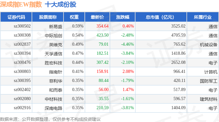 证券之星消息,9月24日,深成指EW(399659)指数报收于4600.45点,涨1.73%,成交7100.87亿元,换手率2.28%。当日该指数成份股中,上涨的有423家,江丰电子以20.0%的涨幅领涨,下跌的有70家,利欧股份以6.55%的跌幅领跌。