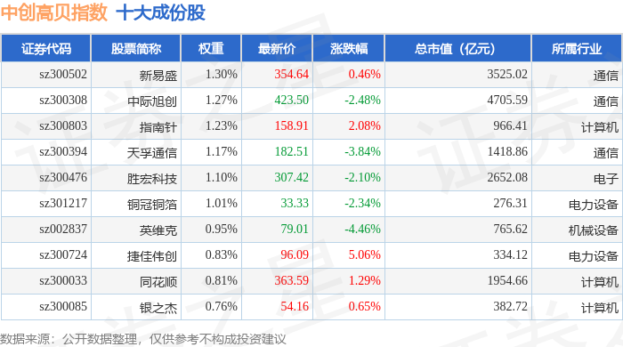 证券之星消息,9月24日,中创高贝(399666)指数报收于2016.54点,涨2.32%,成交3759.59亿元,换手率4.87%。当日该指数成份股中,上涨的有176家,江丰电子以20.0%的涨幅领涨,下跌的有23家,英维克以4.46%的跌幅领跌。