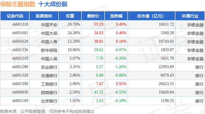 证券之星消息,9月24日,保险主题(399809)指数报收于2266.34点,涨0.18%,成交238.75亿元,换手率0.25%。当日该指数成份股中,上涨的有9家,中粮资本以1.5%的涨幅领涨,下跌的有8家,农业银行以1.2%的跌幅领跌。