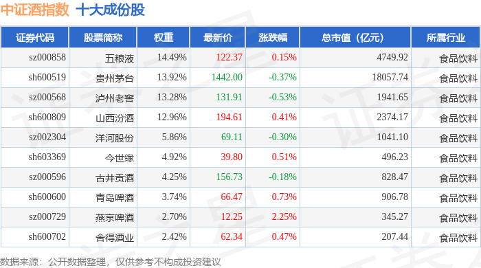中证酒(399987)指数十大成份股详情如下: