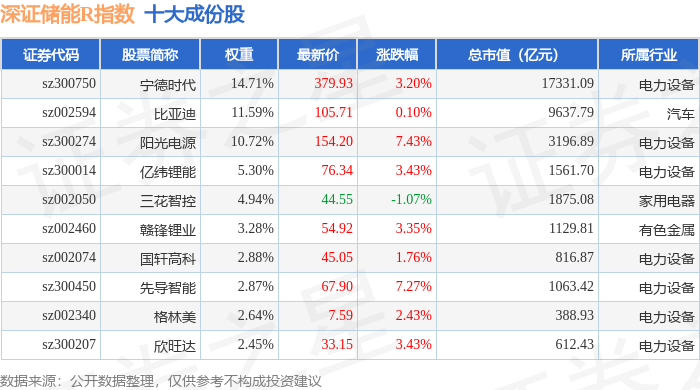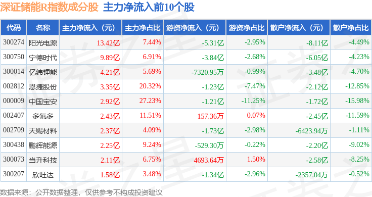 资金流向方面,深证储能R(470036)指数成份股当日主力资金净流入合计26.08亿元,游资资金净流出合计13.89亿元,散户资金净流出合计12.19亿元。成份股资金流向详情见下表: