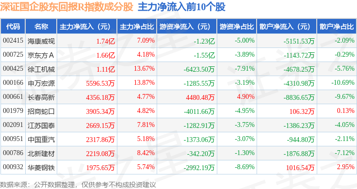 资金流向方面,深证国企股东回报R(470064)指数成份股当日主力资金净流入合计2.84亿元,游资资金净流出合计4.44亿元,散户资金净流入合计1.6亿元。成份股资金流向详情见下表: