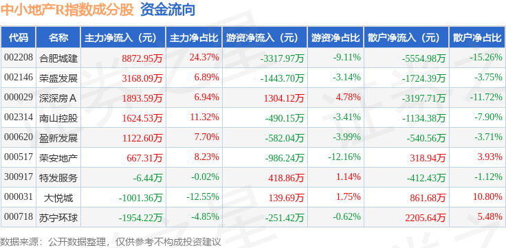 资金流向方面,中小地产R(471002)指数成份股当日主力资金净流入合计1.44亿元,游资资金净流出合计5208.85万元,散户资金净流出合计9178.2万元。成份股资金流向详情见下表: