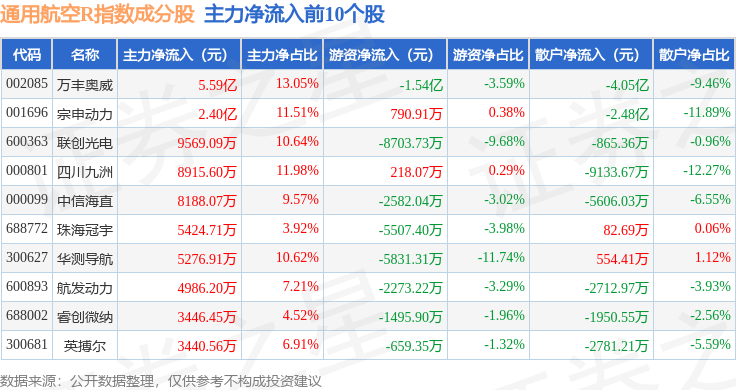 资金流向方面,通用航空R(480076)指数成份股当日主力资金净流入合计8.64亿元,游资资金净流出合计5.77亿元,散户资金净流出合计2.88亿元。成份股资金流向详情见下表: