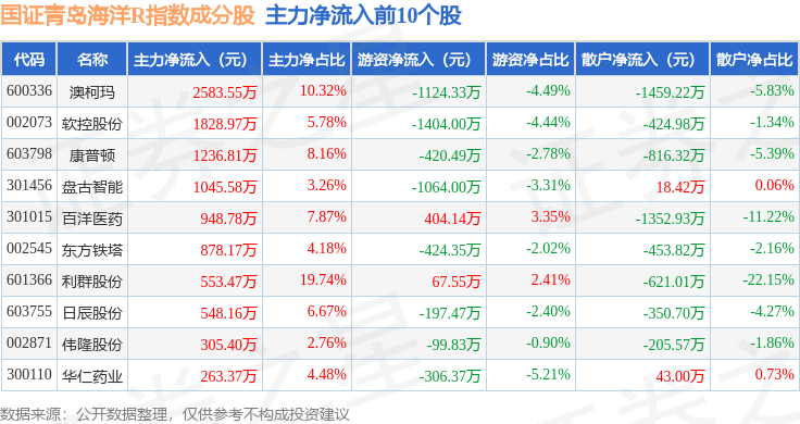 资金流向方面,国证青岛海洋R(480532)指数成份股当日主力资金净流出合计2.04亿元,游资资金净流出合计4535.23万元,散户资金净流入合计2.49亿元。成份股资金流向详情见下表: