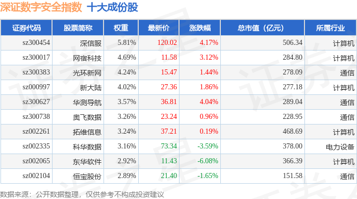 证券之星消息,9月24日,深证数字安全(970052)指数报收于3792.13点,涨1.56%,成交424.84亿元,换手率5.65%。当日该指数成份股中,上涨的有44家,智微智能以7.44%的涨幅领涨,下跌的有6家,东华软件以6.08%的跌幅领跌。