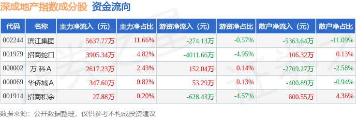 资金流向方面,深成地产(971001)指数成份股当日主力资金净流入合计1.25亿元,游资资金净流出合计4708.9万元,散户资金净流出合计7826.93万元。成份股资金流向详情见下表: