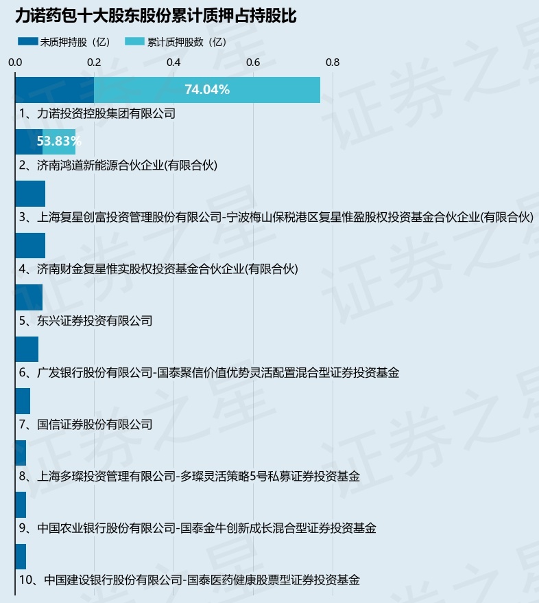 截止本公告日,股东力诺投资控股集团有限公司已累计质押股份5693.0万股,占其持股总数的74.04%,股东济南鸿道新能源合伙企业(有限合伙)已累计质押股份817.0万股,占其持股总数的53.83%。本次质押后力诺药包十大股东的累计质押股份占持股比例(占持股比例的计算以公司最新一期财务报表公布的十大股东的持股总数为基准)见下图:
