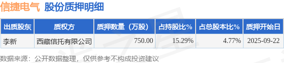 证券之星消息,信捷电气(603416)9月24日公开信息显示,股东李新向西藏信托有限公司合计质押750.0万股,占总股本4.77%。质押详情见下表: