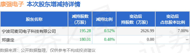 证券之星消息,9月24日康强电子发布公告《康强电子:关于持股5%以上股东权益变动触及1%整数倍的公告》,其股东郑康定、宁波司麦司电子科技有限公司于2025年6月23日至2025年9月24日间合计减持375.29万股,占公司目前总股本的1.0001%,变动期间该股股价上涨8.12%,截止9月24日收盘报17.97元。