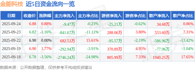 9月24日的资金流向数据方面,主力资金净流出9.47万元,占总成交额0.23%,游资资金净流出25.21万元,占总成交额0.62%,散户资金净流入34.68万元,占总成交额0.86%。
