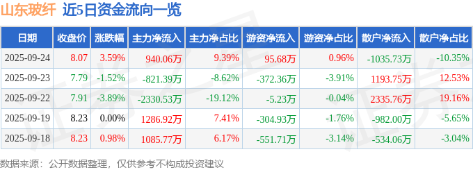证券之星消息,截至2025年9月24日收盘,山东玻纤(605006)报收于8.07元,上涨3.59%,换手率2.11%,成交量12.68万手,成交额1.0亿元。