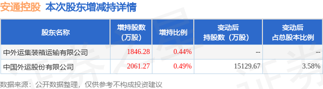 证券之星消息,9月24日安通控股发布公告《安通控股:关于持股5%以上股东及其一致行动人权益变动后持股比例触及1%整数倍的提示性公告》,其股东中国外运股份有限公司、中外运集装箱运输有限公司于2025年9月17日至2025年9月24日间合计增持3907.55万股,占公司目前总股本的0.9234%,变动期间该股股价上涨3.02%,截止9月24日收盘报3.75元。
