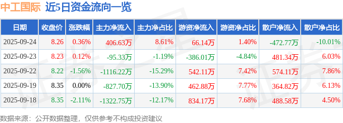 证券之星消息,截至2025年9月24日收盘,中工国际(002051)报收于8.26元,上涨0.36%,换手率0.46%,成交量5.74万手,成交额4722.78万元。