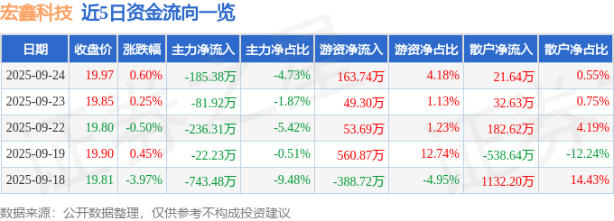 证券之星消息,截至2025年9月24日收盘,宏鑫科技(301539)报收于19.97元,上涨0.6%,换手率2.62%,成交量1.97万手,成交额3916.45万元。