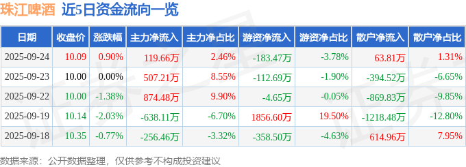 证券之星消息,截至2025年9月24日收盘,珠江啤酒(002461)报收于10.09元,上涨0.9%,换手率0.22%,成交量4.82万手,成交额4858.59万元。