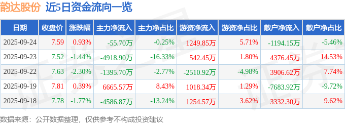 证券之星消息,截至2025年9月24日收盘,韵达股份(002120)报收于7.59元,上涨0.93%,换手率1.03%,成交量28.91万手,成交额2.19亿元。