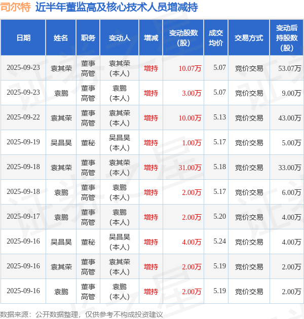 证券之星消息,根据9月24日市场公开信息、上市公司公告及交易所披露数据整理,司尔特(002538)最新董监高及相关人员股份变动情况:2025年9月23日公司董事,高管袁其荣、董事,高管袁鹏共增持公司股份13.07万股,占公司总股本为0.0153%。变动期间公司股价下跌0.2%,9月23日当日收盘报5.11元。