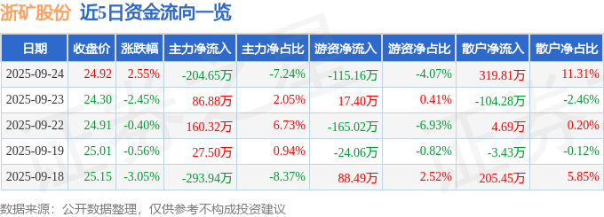 证券之星消息,截至2025年9月24日收盘,浙矿股份(300837)报收于24.92元,上涨2.55%,换手率1.62%,成交量1.15万手,成交额2826.51万元。