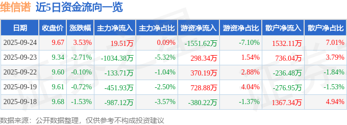 证券之星消息,截至2025年9月24日收盘,维信诺(002387)报收于9.67元,上涨3.53%,换手率1.64%,成交量22.89万手,成交额2.19亿元。