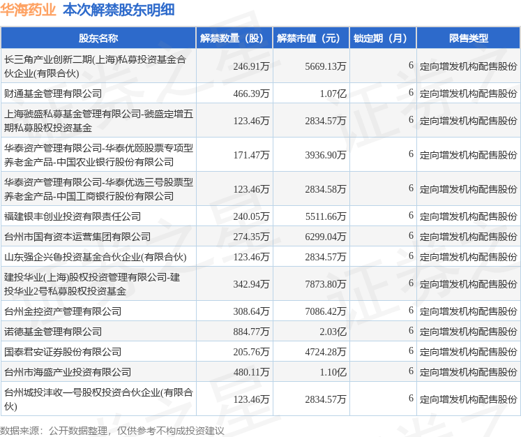 证券之星消息,根据市场公开信息整理,华海药业(600521)于9月25日将有4115.23万股限售股份解禁,为公司定向增发机构配售股份,占公司总股本2.75%。(本次数据根据历史公告整理得出,实际情况以上市公司最新公告为准)本次解禁后,公司已无限售股份。具体如下图所示:
